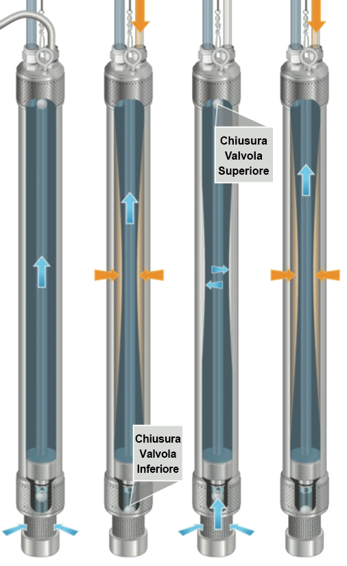 Riepilogando: la bladder pump è costituita da un involucro cilindrico in acciaio inox con all’interno una vescica collegata ad un tubo (tubo di campionamento) che permette di prelevare il campione, in basso è presente un filtro che permette di far affluire l’acqua all’interno della vescica, un secondo tubo (tubo di azionamento) porta aria compressa (o altri gas) tra l’involucro in acciaio e la vescica, spremendola e facendo risalire l’acqua attraverso il tubo di campionamento. Due valvole a sfera, in fondo alla pompa e una sopra, cha aprendosi e chiudendosi alternativamente, consentono all’acqua di entrare e di salire per il tubo di campionamento. La bladder pump è quindi una pompa ad azionamento pneumatico, che funziona mediante un gas compresso, che solitamente è aria compressa o azoto.